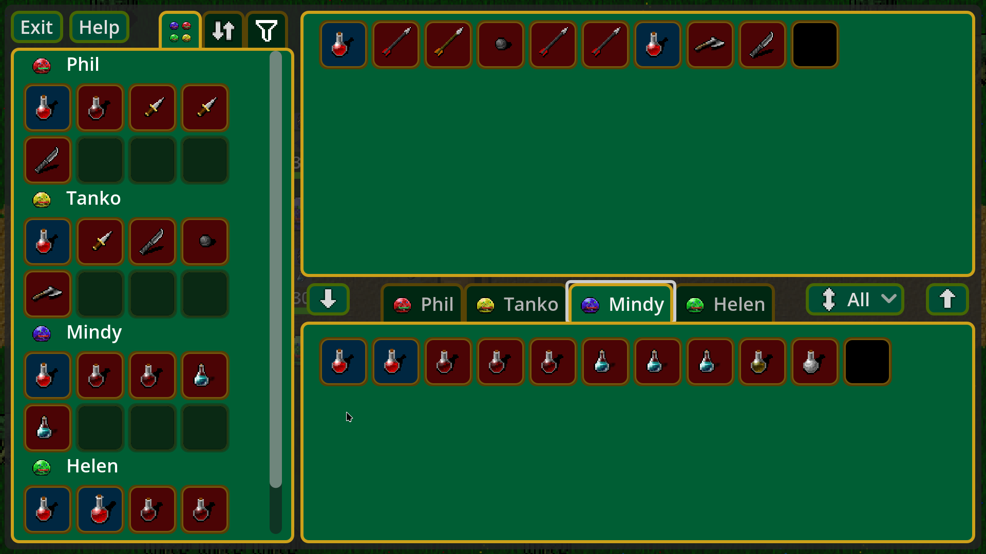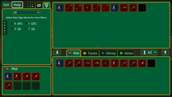 The UI has been rearranged. Based on comments, it seems that the filter system is not being used much. Having so many items, we designed the inventory intending for the filters to be used to better manage them. Filtering by level is especially useful while the store has not yet been implemented. With it being behind a popup and needing extra button presses, it was a bit unwieldily. We have now changed the left side to only show the currently selected Slime’s belt, instead of all the Slimes. The top left now holds a tab bar which includes the filters. The filter screen itself has also been overhauled. Most prominent is that the filters are now applied immediately as you select them, rather than requiring the press of another button. They also remain in effect between battles, rather than showing all items when next opened. Should you want to swap items among the Slimes’ belts, there is a tab to show them all.