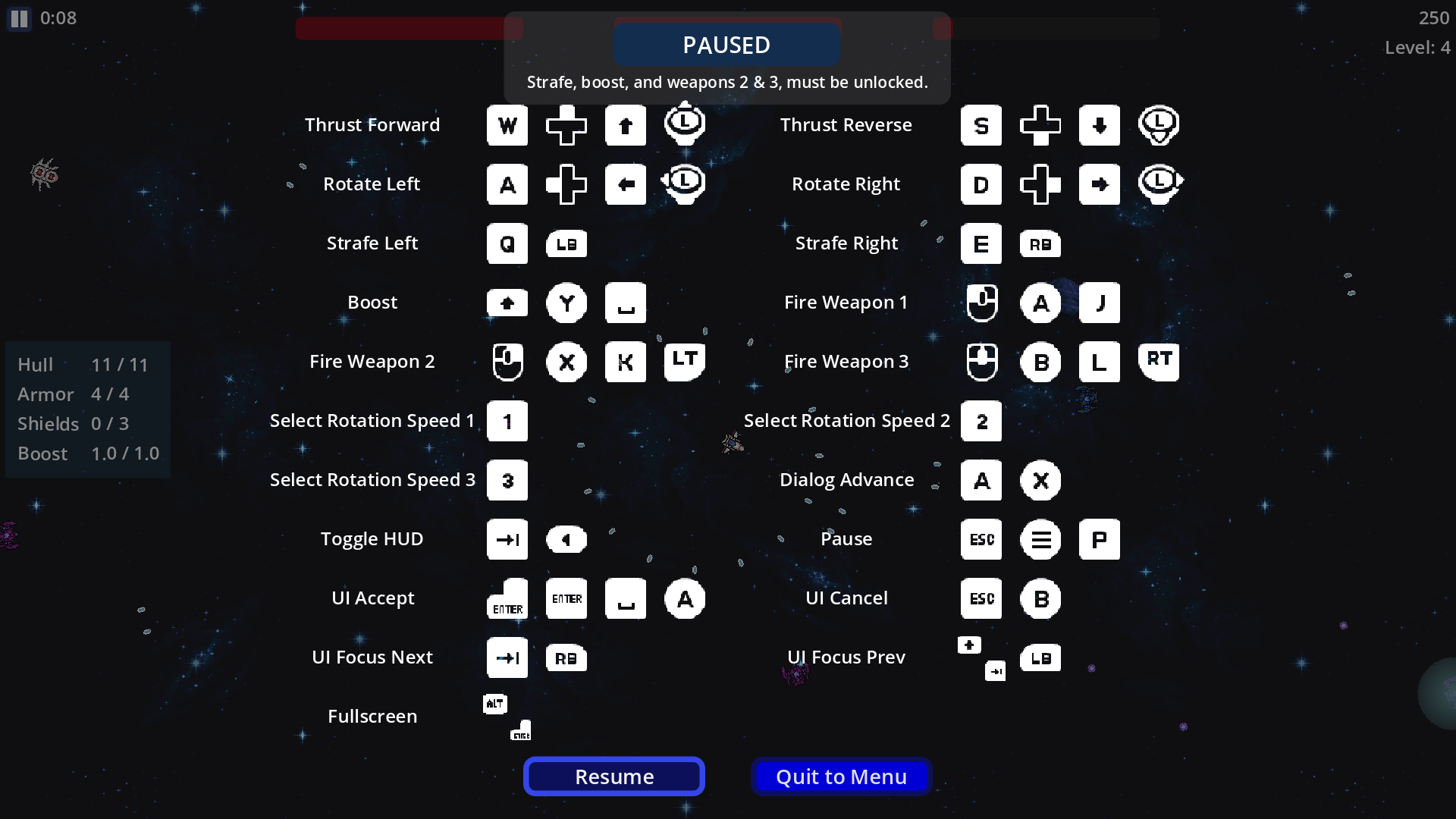 The game can be played with keyboard, keyboard/mouse, or controller. Input remapping is supported. The current controls are shown on the pause screen. In addition to being able to increase the base speed of your rotation in the upgrades screen, you can also set it into 3 states of half, normal, and double speed.