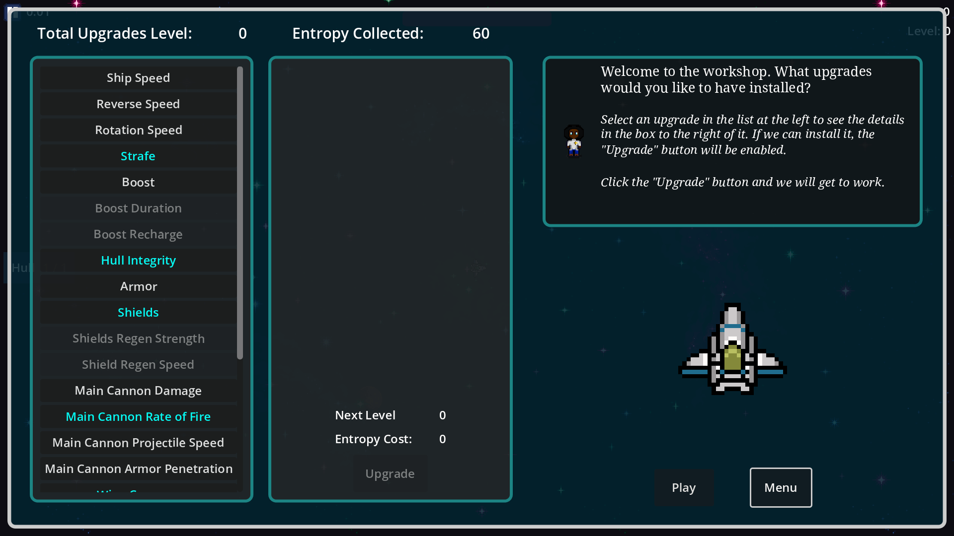 Fight your way through an onslaught of enemy craft. Each time your ship is destroyed, you will be brought back to the upgrade screen where you can improve your ship. You keep your entropy and upgrades, allowing you to craft an ever more powerful ship. There is an auto-save feature allowing you to take a break and return later. As you fight your way to higher levels, you can set them (in the settings) as the starting level for future plays. You can, optionally, submit your score to a leaderboard. The leaderboard can be disabled in the settings, or high scores options. In the settings you can adjust the game speed and dialog speed, as well as how many parallax layers are shown, and if the shader transitions are used.